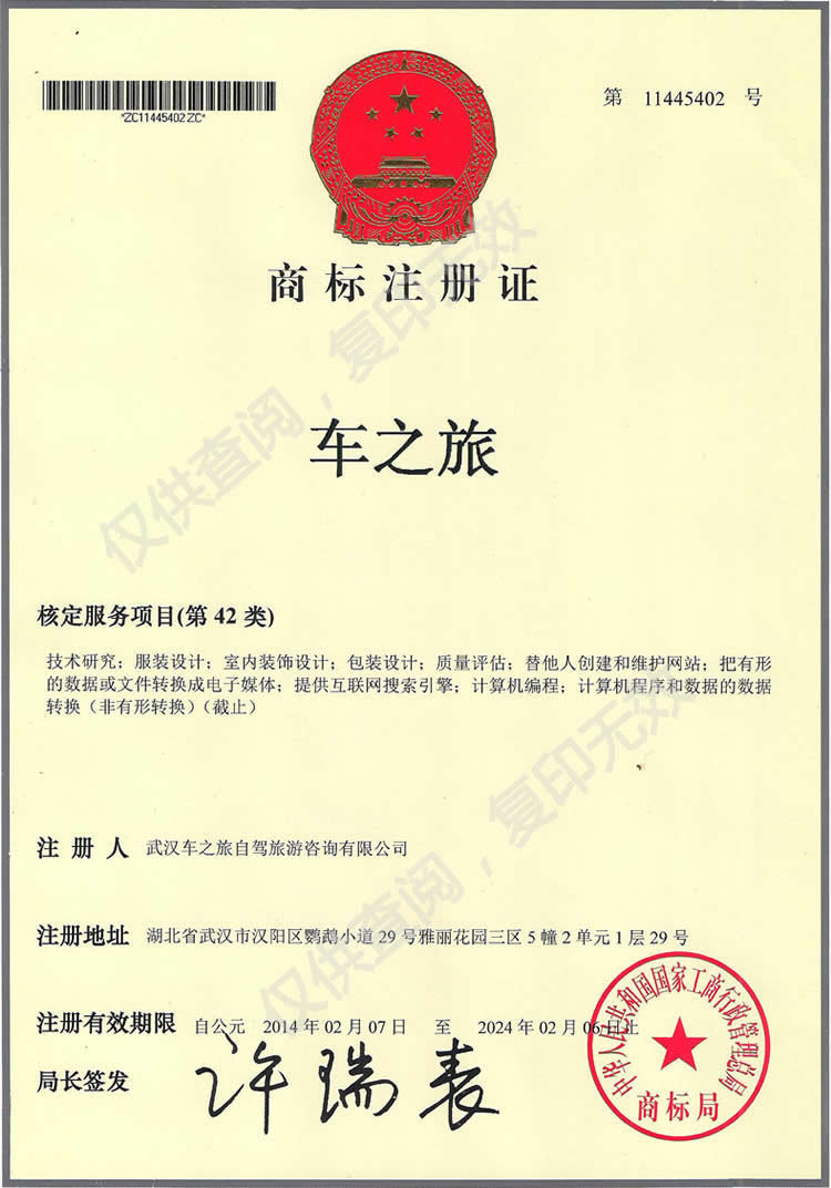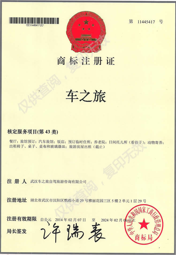 热烈祝贺武汉车之旅自驾旅游咨询有限公司商标注册成功!